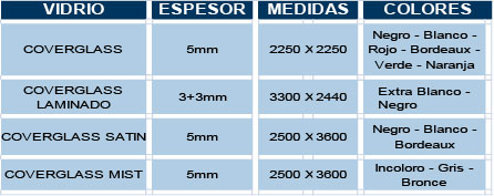 Estos son vidrios monolíticos para revestimientos, no translúcidos, pintados en su cara posterior dejando a la vista un acabado brillante.
